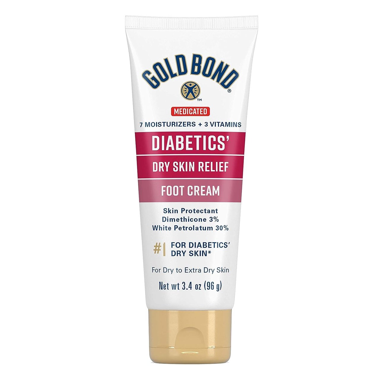 With diabetes, skin can become dry, rough, and generally uncomfortable. GOLD BOND® Ultimate Diabetics Dry Skin Relief Foot Cream is specifically formulated for diabetics dry skin with 7 intensive moisturizers to hydrate and soothe feet while adding a protective layer of moisture for 24 hours.Features: Clinically tested, proven effective9 out of 10 people with diabetes saw noticeable skin improvement in 1 hour*Contains 7 intensive moisturizers with two active ingredients for relieving dry, cracked, calloused heels and feetDermatologist TestedHypoallergenicAbsorbs QuicklyNon-GreasyFragrance Free 24 Hour MoisturizationNo harsh acidsIngredients:Inactive Ingredients: Water; Glycerin; Glyceryl Stearate; Distearyldimonium Chloride; Aloe Barbadensis Leaf Juice; Polyethylene; Stearyl Alcohol; Cetearyl Alcohol; Methyl Gluceth-20; Steareth-2; Steareth-21; Allantoin; Cocamidopropyl Hydroxypropyl Hydrolyzed Rice Protein; Cetyl Alcohol; Tocopheryl Acetate; Butyrospermum Parkii (Shea) Butter Extract; PEG-10 Phytosterol; Polysorbate 60; Ceramide 2; Hydrolyzed Collagen; Stearamidopropyl PG-Dimonium Chloride Phosphate; Jojoba Esters; DMDM Hydantoin; Magnesium Ascorbyl Phosphate; Butylene Glycol; Methylparaben; Palmitoyl Hexapeptide-12; Propylene Glycol; Hydrolyzed Jojoba Esters; Propylparaben; EDTA; Potassium Hydroxide; Tribehenin; C12-15 Alkyl Benzoate; Retinyl PalmitateActive Ingredients: Dimethicone 3% - Skin Protectant.White Petrolatum 30% - Skin Protectant.Inactive Ingredients: Water, Glycerin, Glyceryl Stearate, Distearyldimonium Chloride, Aloe Barbadensis Leaf Juice, Polyethylene, Stearyl Alcohol, Cetearyl Alcohol, Methyl Gluceth-20, Behentrimonium Methosulfate, Steareth-21, Steareth-2, Allantoin, Cocodimonium Hydroxypropyl Hydrolyzed Rice Protein, Cetyl Alcohol, Tocopheryl Acetate, Butyrospermum Parkii (Shea) Butter Extract, PEG-10 Rapeseed Sterol, Polysorbate 60, Ceramide 2, Hydrolyzed Collagen, Stearamidopropyl PG-Dimonium Chloride Phosphate, Jojoba Esters, DMDM Hydantoin, Magnesium Ascorbyl Phosphate, Butylene Glycol, Methylparaben, Palmitoyl Oligopeptide, Propylene Glycol, Hydrolyzed Jojoba Esters, Propylparaben, EDTA, Potassium Hydroxide, Tribehenin, C12-15 Alkyl Benzoate, Retinyl Palmitate (309-007).You may return most new, unopened items within 30 days of delivery for a full refund. We will cover the cost of return shipping if the return is a result of our error (such as receiving a defective or incorrect item).