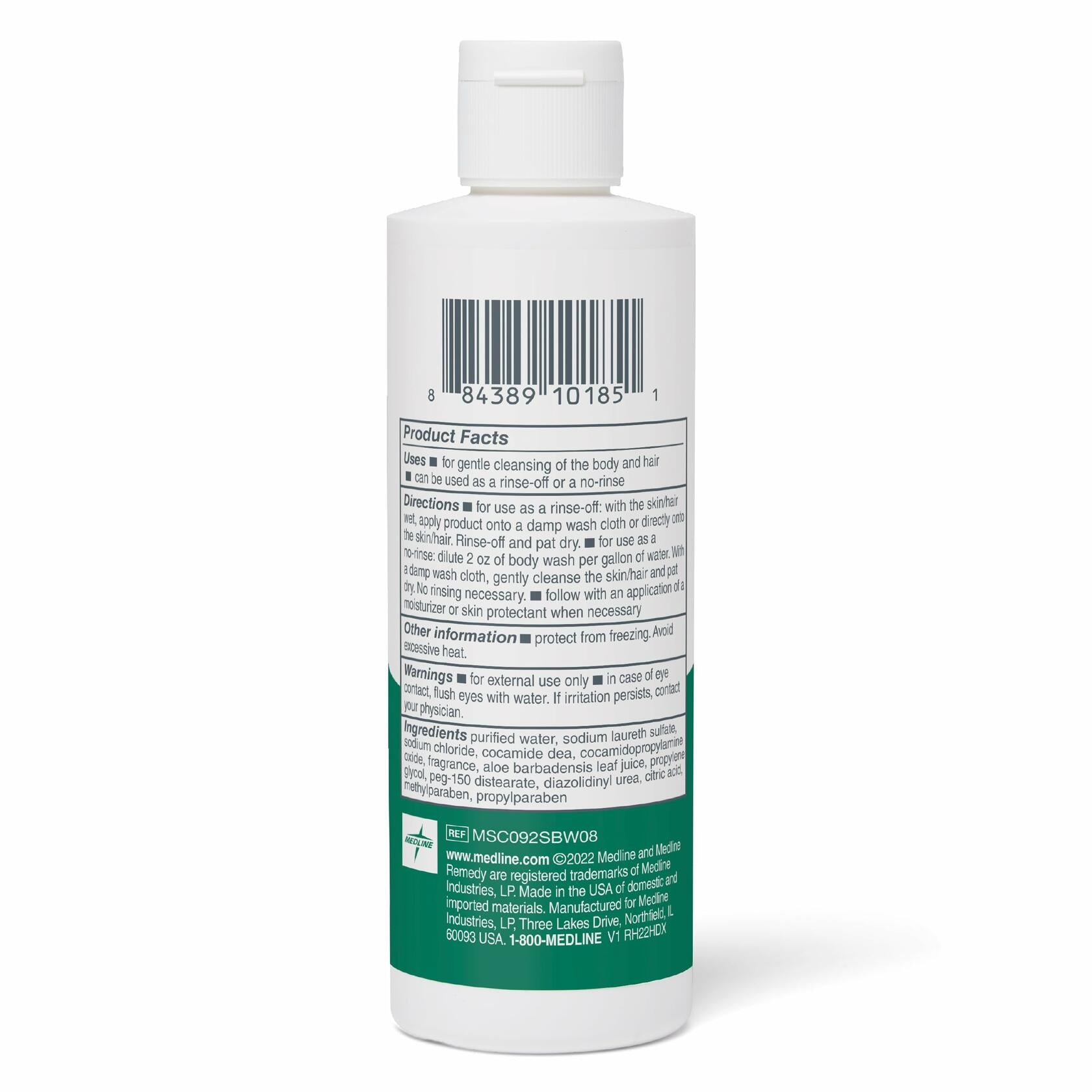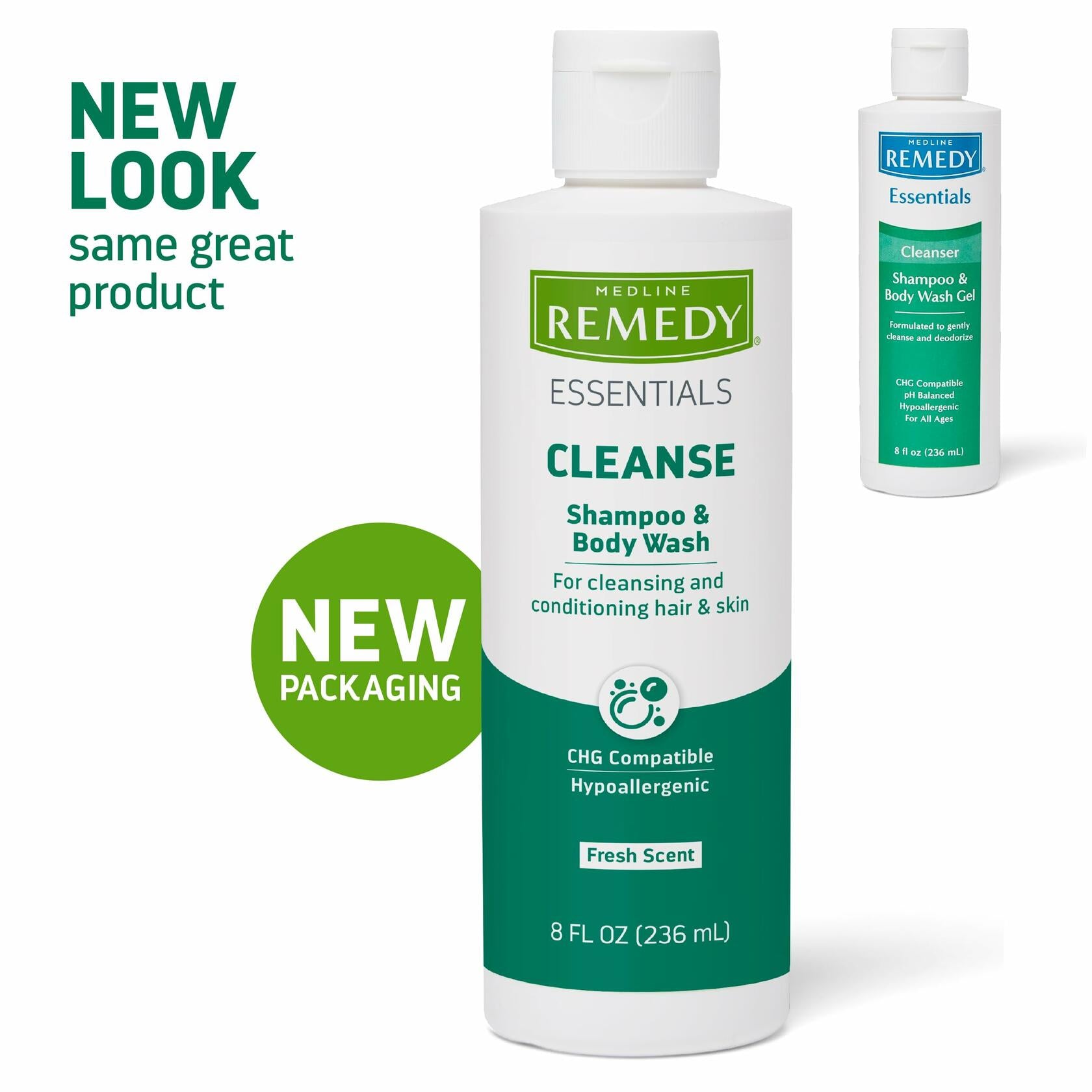 Remedy Essentials Shampoo and Body Wash, 8 oz. Mild head-to-toe formula contains gentle, clinically effective ingredients to be used as a rinse-off, full body cleanserin the bath or shower or diluted 10:1 for bedside cleanups after incontinent episodes or for anyone with limited mobility Economical 2-in-1 shampoo & body wash is Hypoallergenic, pH-balanced, and CHG compatible Low sudsing for easy rinsing Light, fresh scent