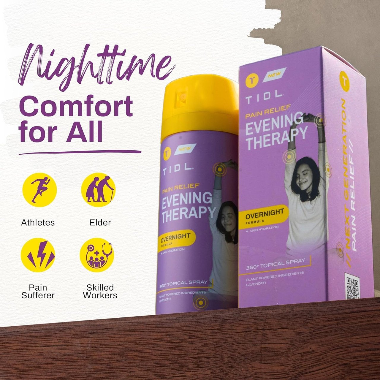 Standard Nighttime Pain Sprays (The Problem) TIDL Evening Therapy Lavender Spray (The Solution) ❌ Disruptive, Medicinal Smell: Strong, clinical odors can be overpowering and disrupt your sleep environment. ✅ Calming Lavender Scent: Infused with natural lavender to create a peaceful, spa-like atmosphere that promotes relaxation and sleep. ❌ Intense, Wake-Up Sensations: Some formulas cause a jarring, intense cooling or heating effect that can be stimulating, not soothing. ✅ Gentle, Gradual Cooling: Provides a soft, comforting coolness designed to relax muscles and calm the mind without shock or discomfort. ❌ One-Dimensional Relief: Only target physical pain, ignoring the mental tension that often prevents restful sleep. ✅ Dual-Action Mind & Body Relief: Addresses both physical muscle discomfort and mental stress, preparing your entire being for rest. ❌ Messy Application: Sprays can be noisy, drip, or feel cold and startling on the skin at night. ✅ Fine, Quiet Mist: A gentle, even mist application that is quiet and non-disruptive, perfect for a pre-sleep ritual.You may return most new, unopened items within 30 days of delivery for a full refund. We will cover the cost of return shipping if the return is a result of our error (such as receiving a defective or incorrect item).